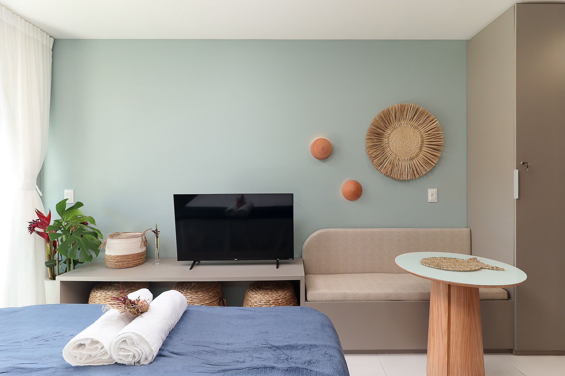Minha família e eu gostamos muito mesmo dos dias que passamos aí. Saímos tristes que acabou. O flat é muito bem decorado, aconchegante, todo planejado e arquitetado. Tudo super limpo e cheiroso, e novinho. Roupas de cama e toalhas limpinhas e cheirosas. Cozinha completa pra preparar café da manhã e até refeições. Não era nem o plano cozinhar, mas estava tão bom o lugar que não quisemos sair para comer no centro. A estrutura do condomínio é excepcional; e não há bagunça, som alto, desorganização ou sujeira. Achei ainda mais bonito e amplo do que aparenta nas fotos. O Mar em frente so da pra ir na maré baixa; a praia de muro alto mesmo, fica um pouco distante a pé. O malai empresta cadeiras e guarda-sol, achei ótimo. Queremos voltar mil vezes.