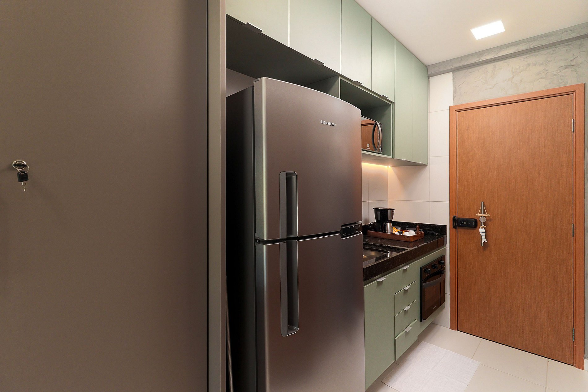 - Cozinha completa com cooktop, forno, geladeira e eletrodomésticos
