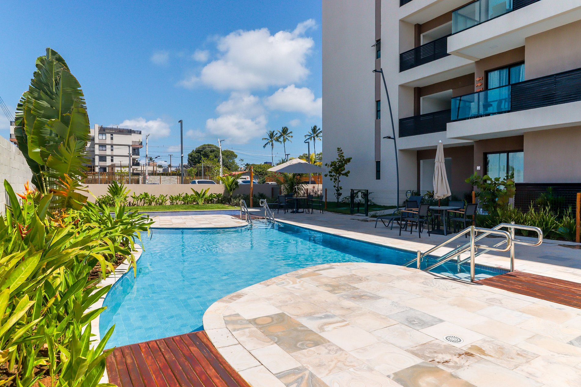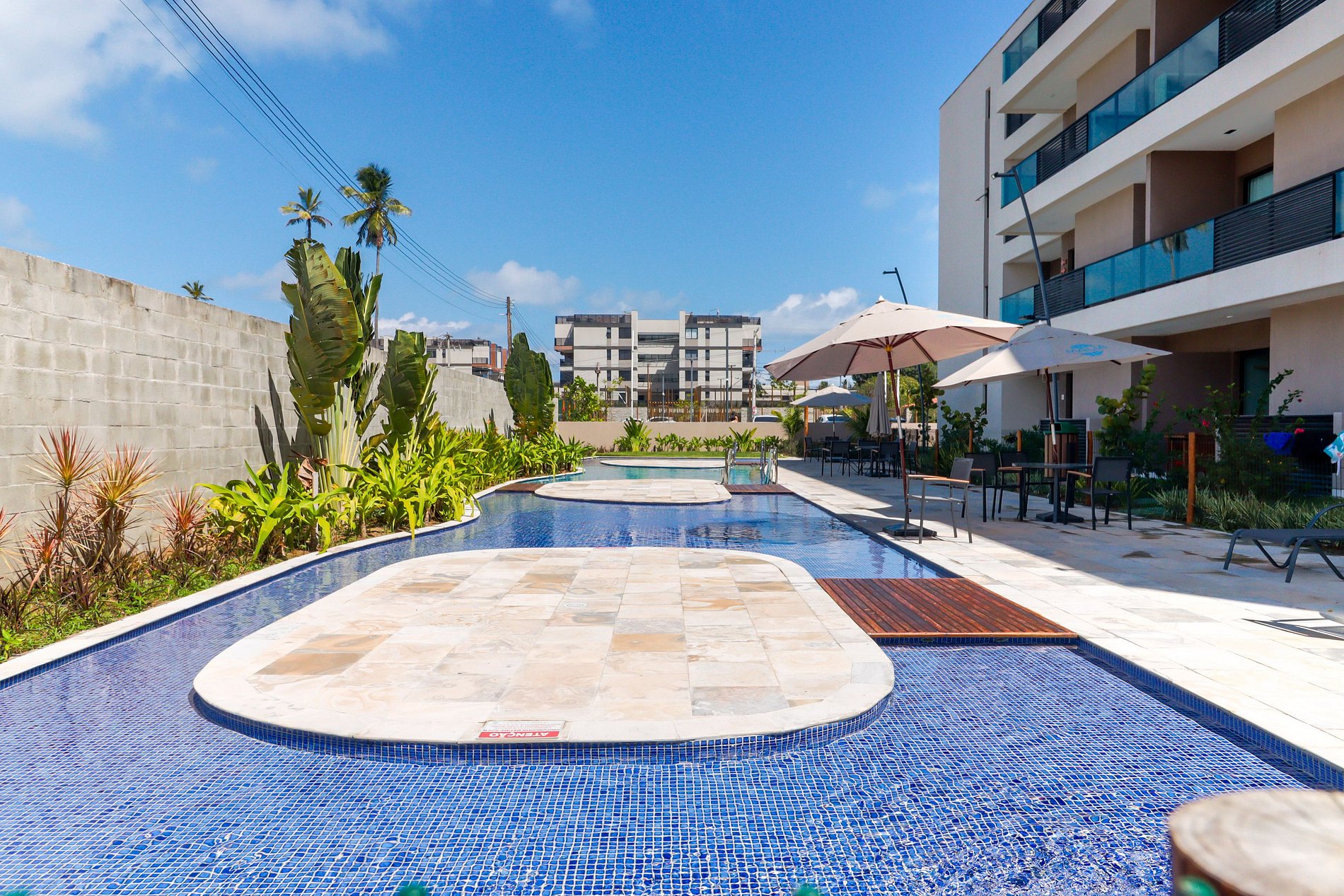 A estrutura do condomínio é excepcional; e não há bagunça, som alto, desorganização ou sujeira. Achei ainda mais bonito e amplo do que aparenta nas fotos. O Mar em frente so da pra ir na maré baixa; a praia de muro alto mesmo, fica um pouco distante a pé. O malai empresta cadeiras e guarda-sol, achei ótimo. Queremos voltar mil vezes.