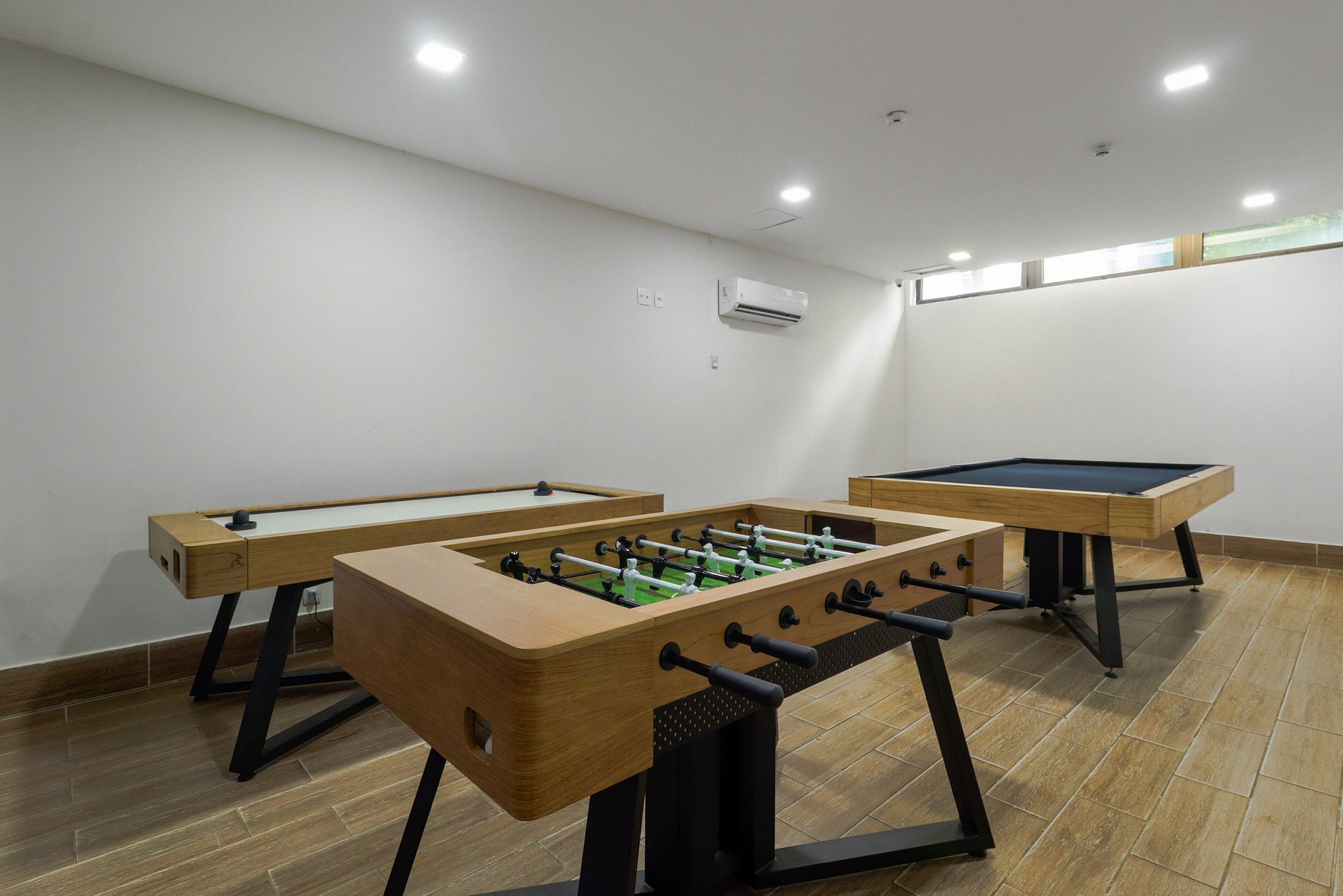 Nosso luxuoso flat na praia de Muro Alto é completo e perfeito para uma estadia inesquecível. Com uma decoração de bom gosto que reflete o clima exótico de um resort beira mar, o flat oferece conforto e elegância. Possui três quartos super novos e bem cuidados, incluindo uma suíte com cama de casal king com vista para o mar, mais uma suíte com cama queen e outro quarto com cama queen. Além disso, há um banheiro social para maior comodidade dos hóspedes.