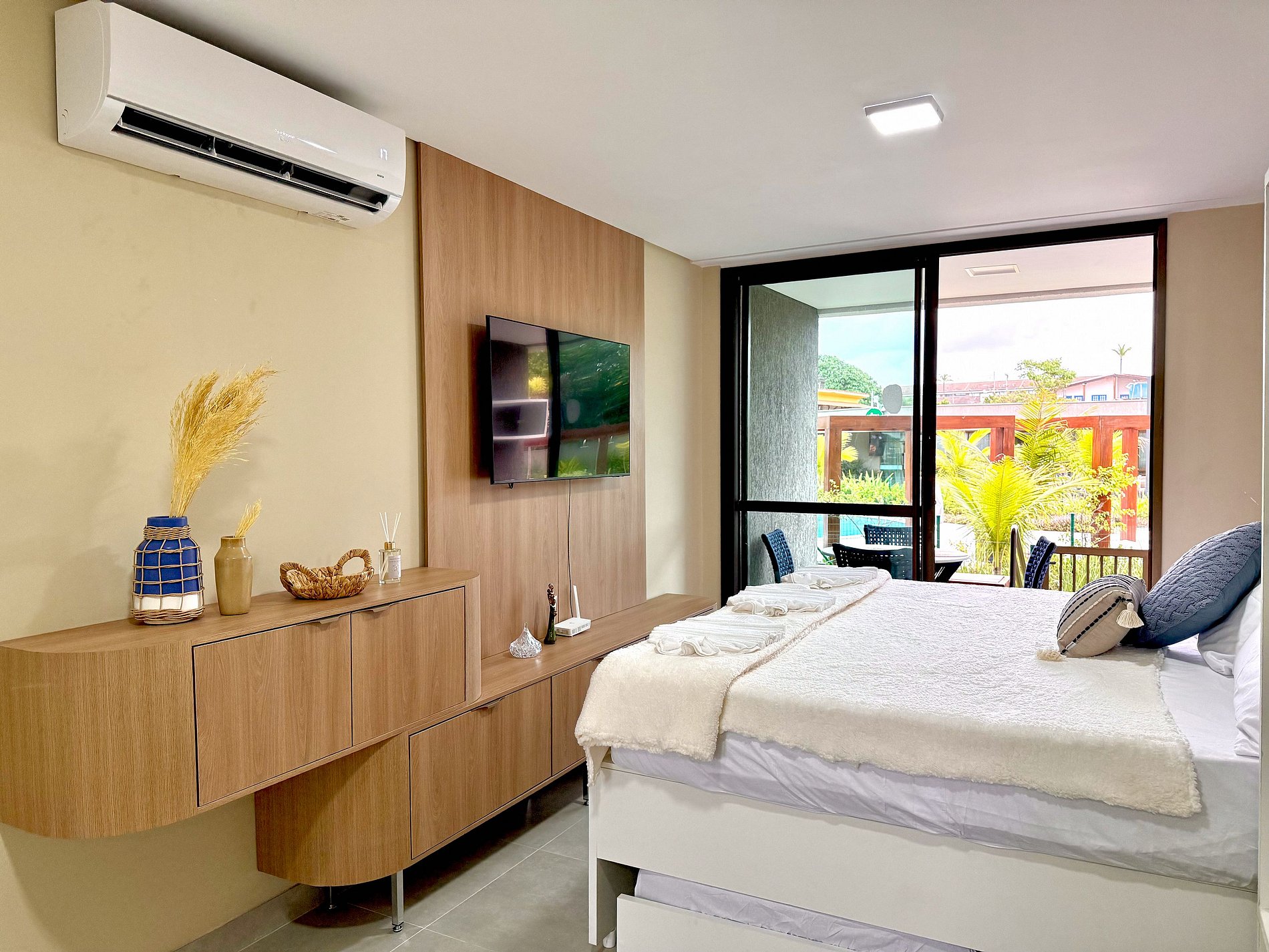 O espaço conta com 1 cama super king e 2 bicamas, acomodando confortavelmente até 4 pessoas. Além disso, possui uma varanda privativa!