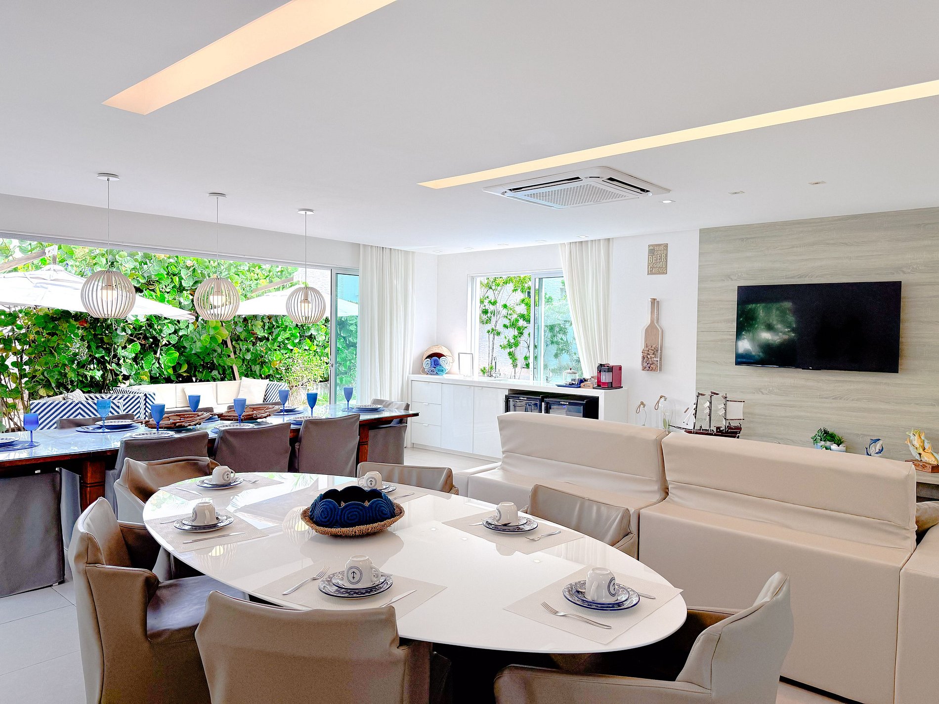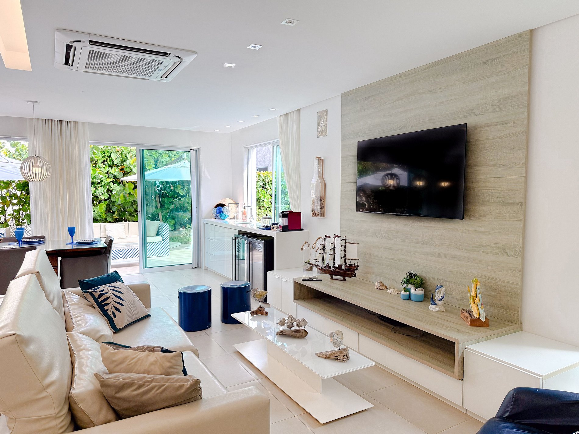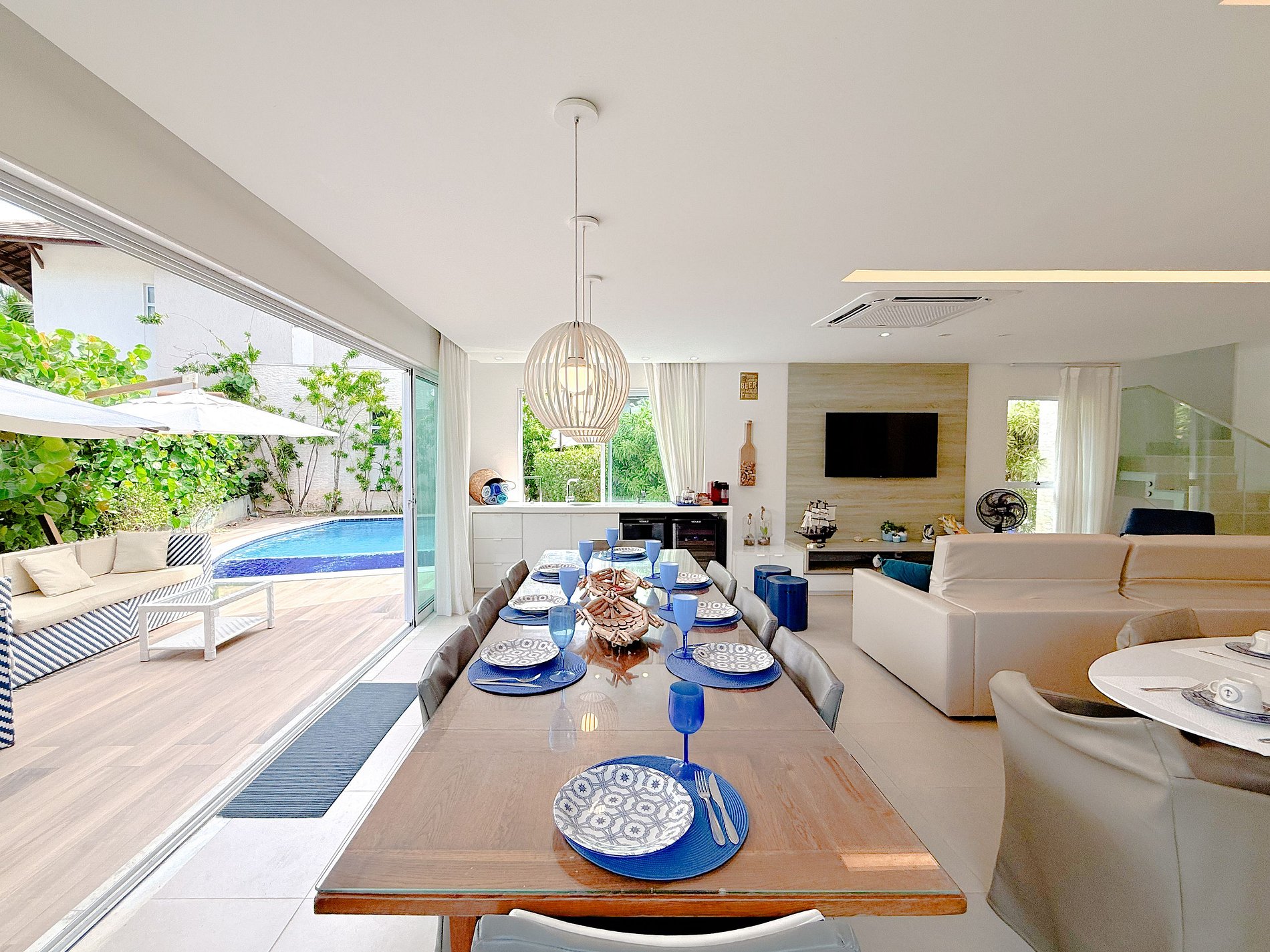 Ampla, integrada à varanda e à cozinha. Ar-condicionado central, Smart TV de grande porte e acesso direto ao deck e à piscina.