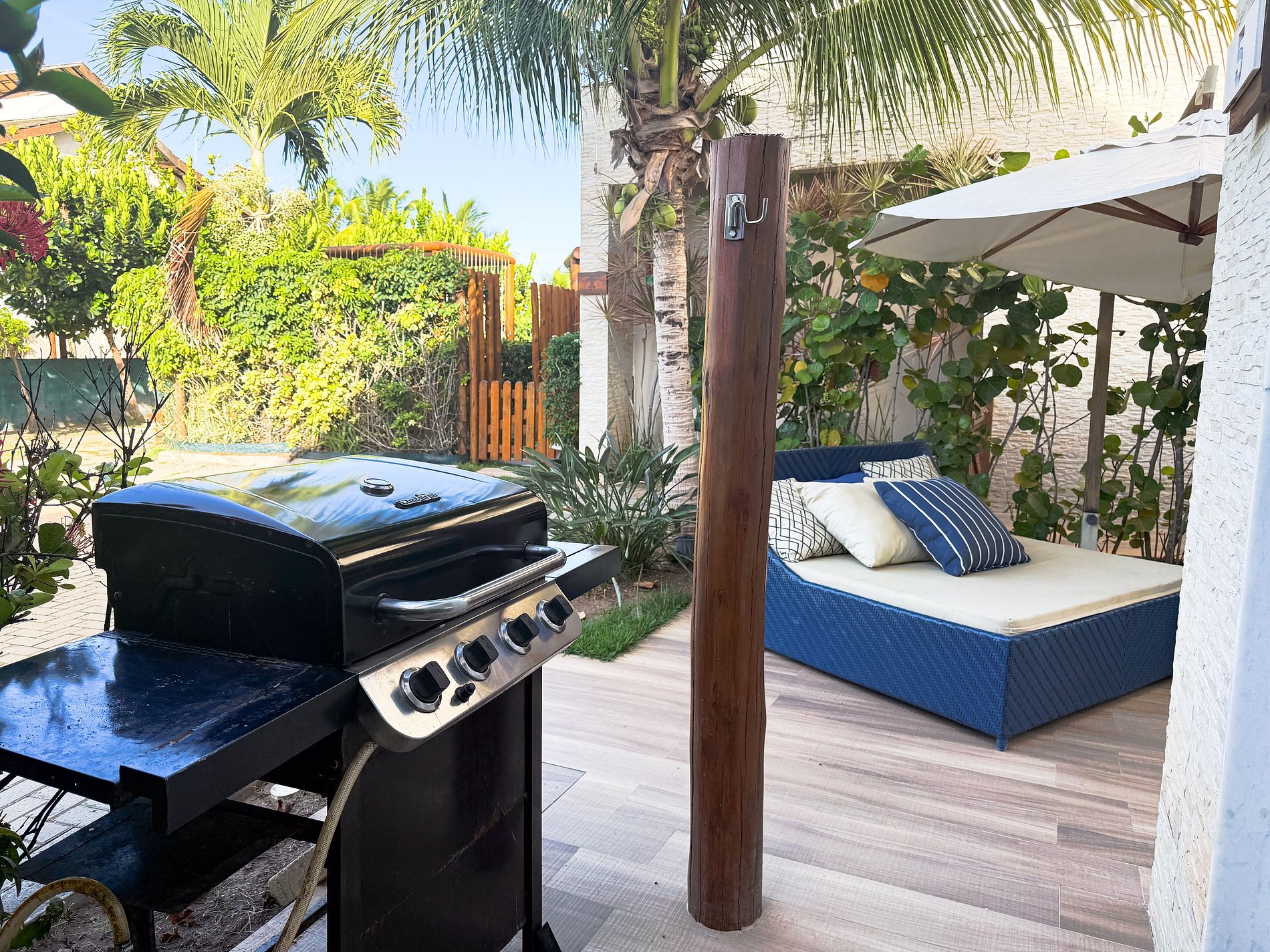 O uso é exclusivo dos hóspedes. A churrasqueira é a gás — não é permitido uso de carvão ou fogueiras na propriedade.