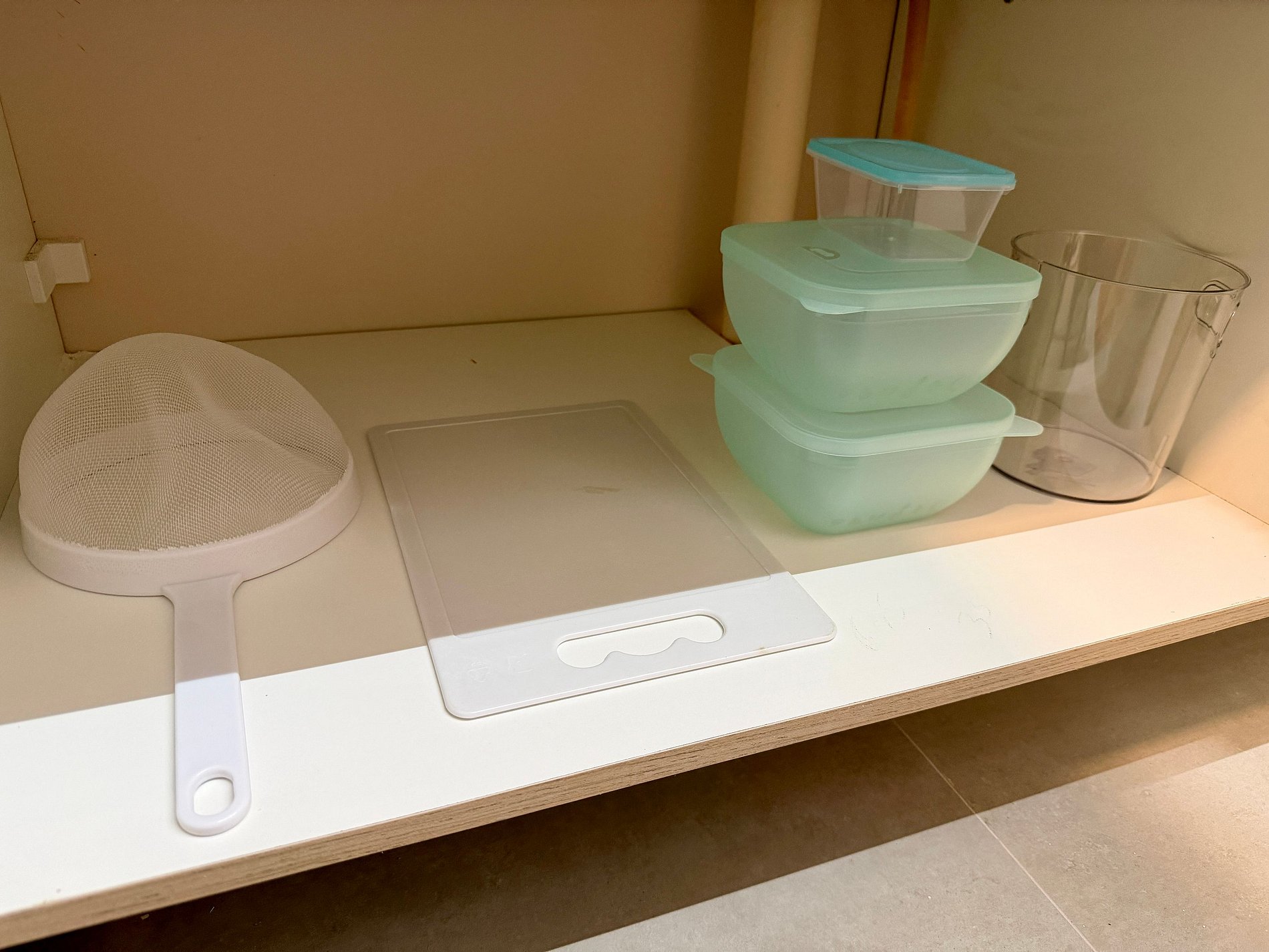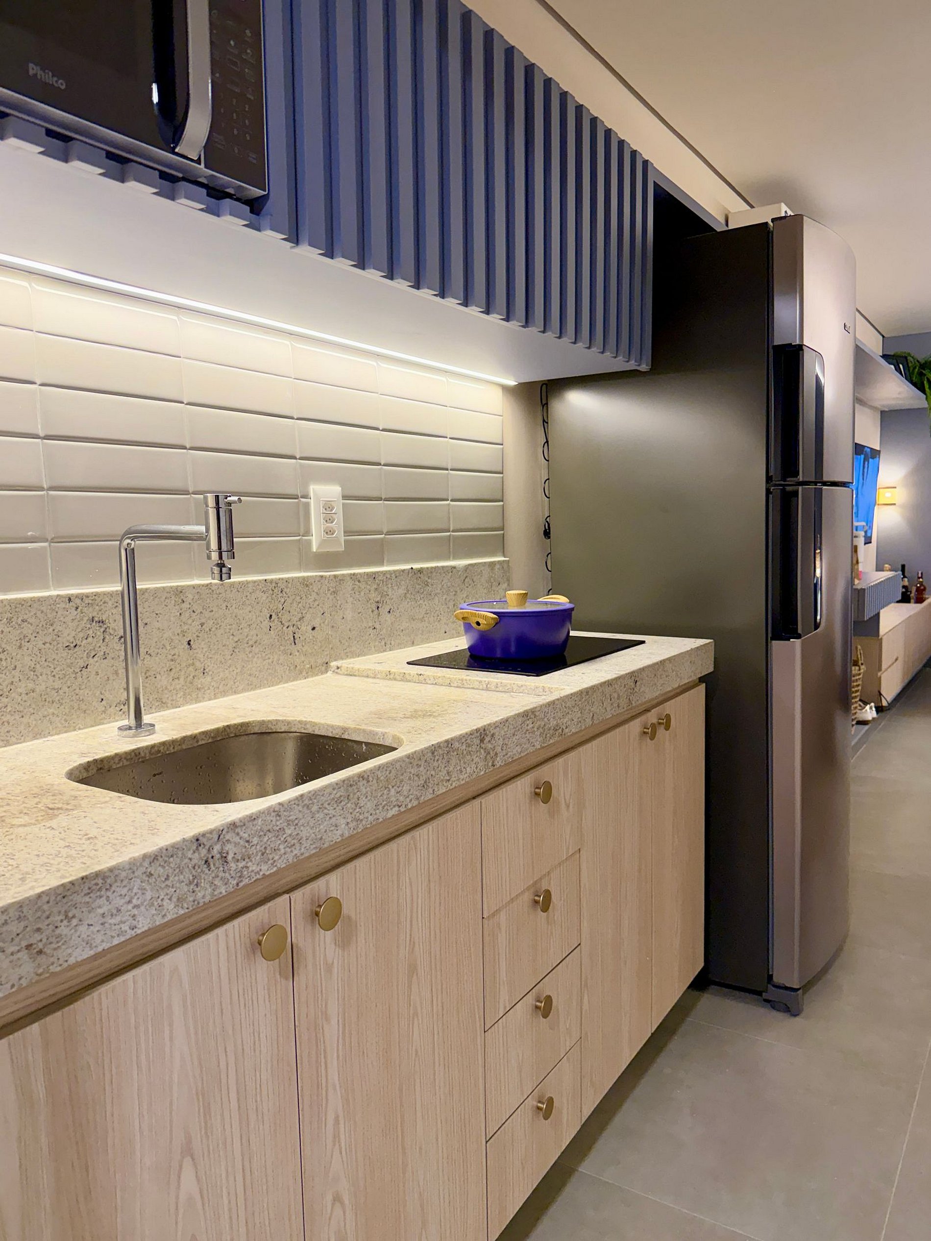Cozinha equipada com fogão elétrico portátil, geladeira e eletrodomésticos