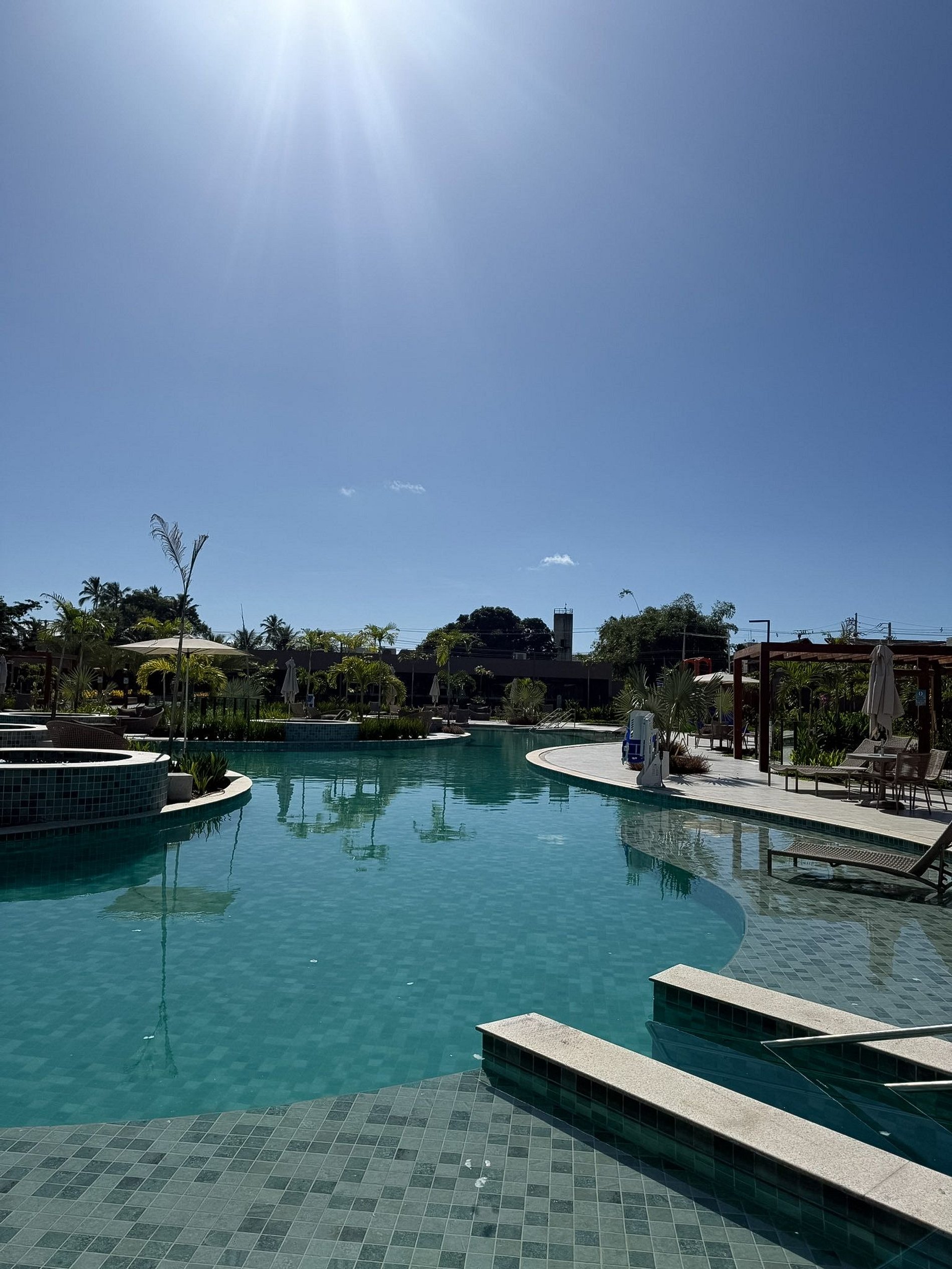 Piscina ampla com área de descanso