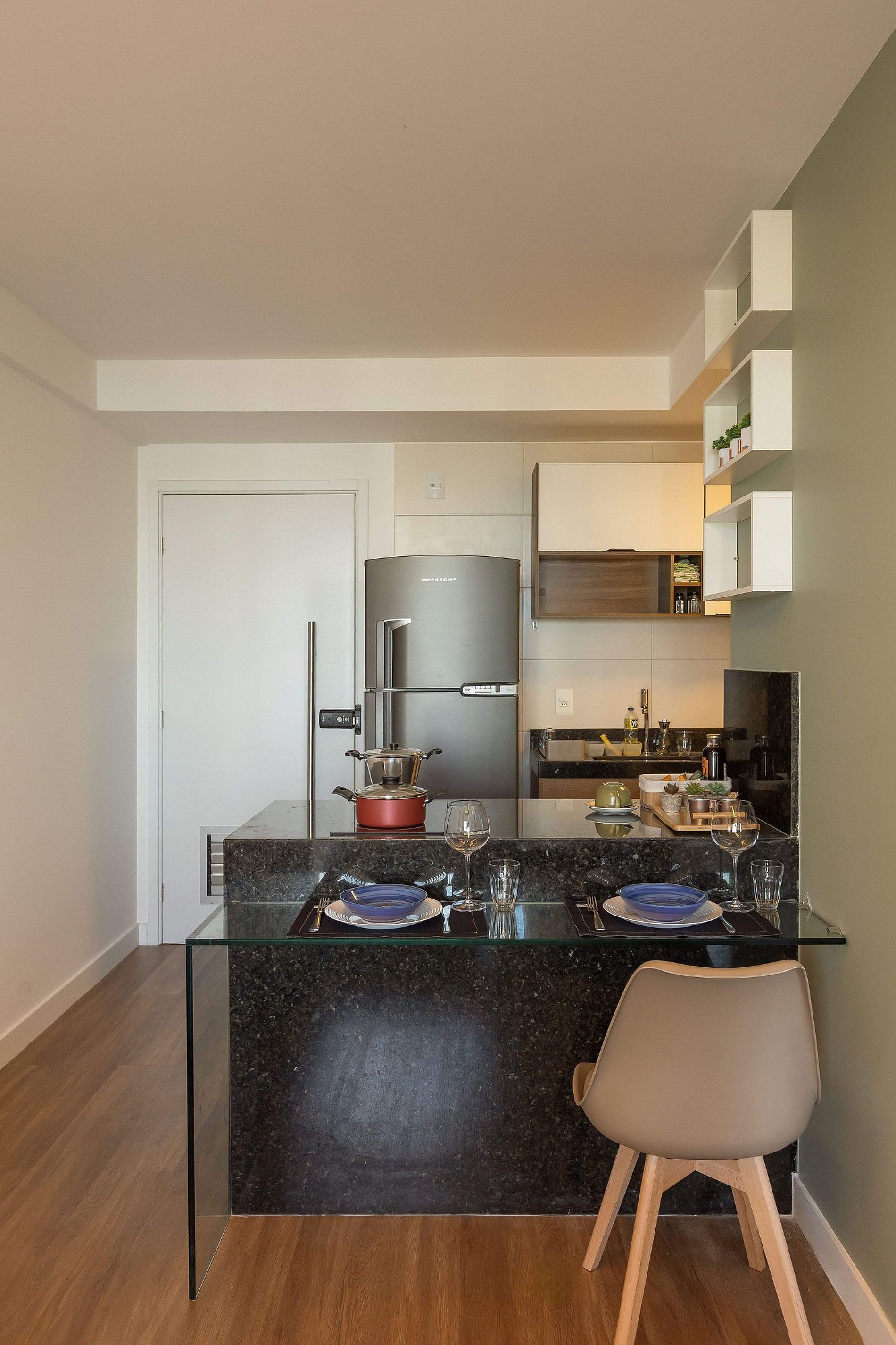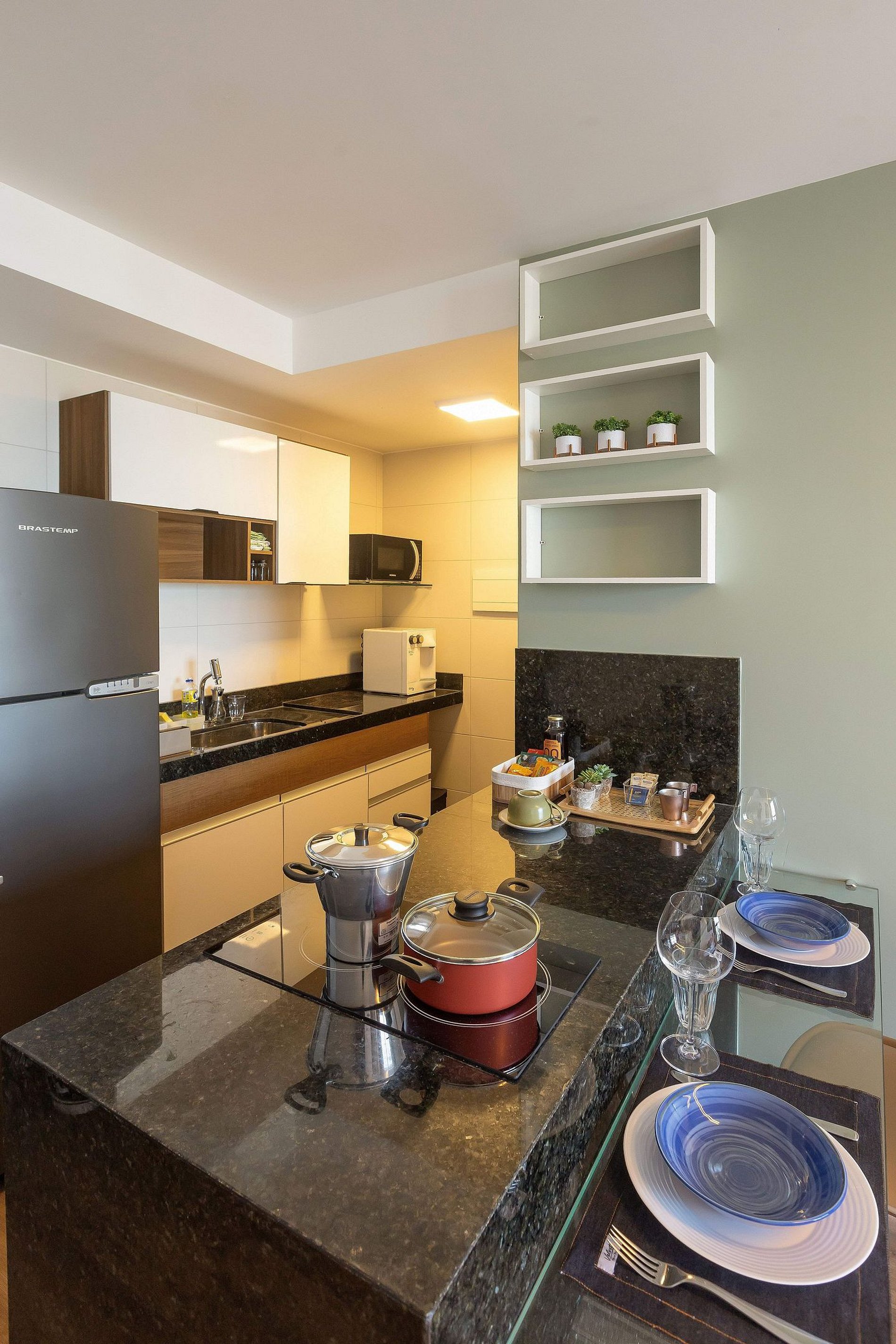 Cozinha completa com cooktop, geladeira e eletrodomésticos